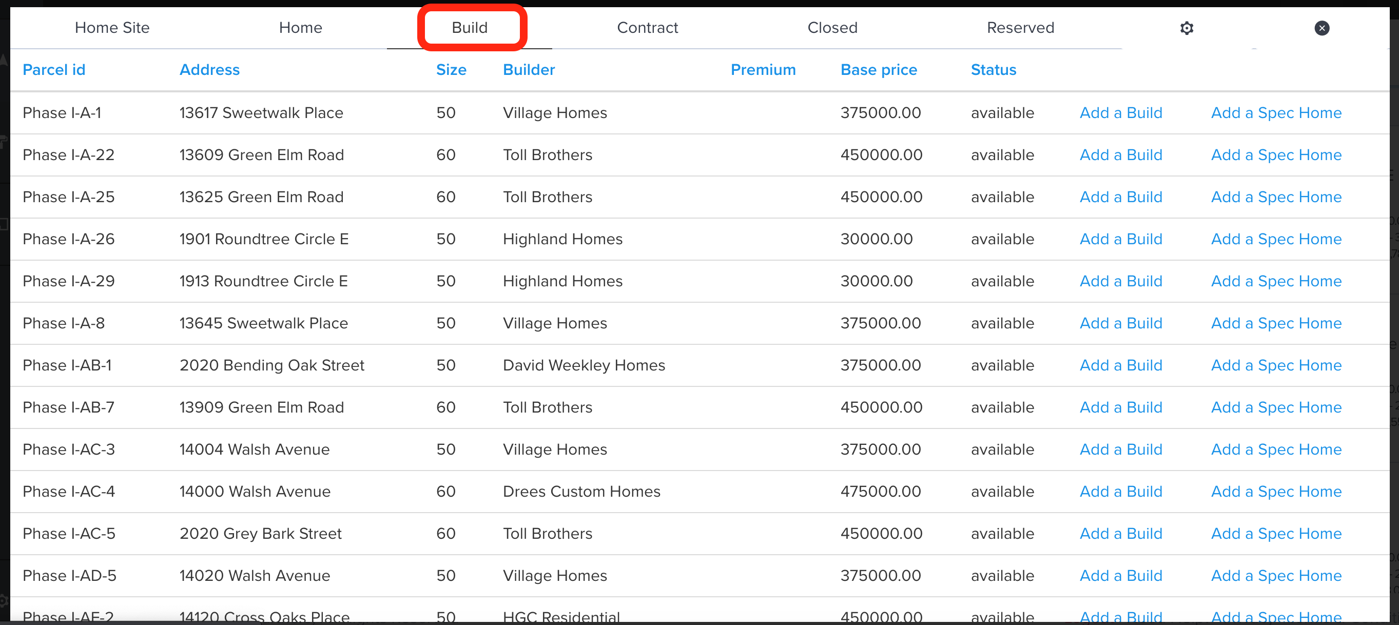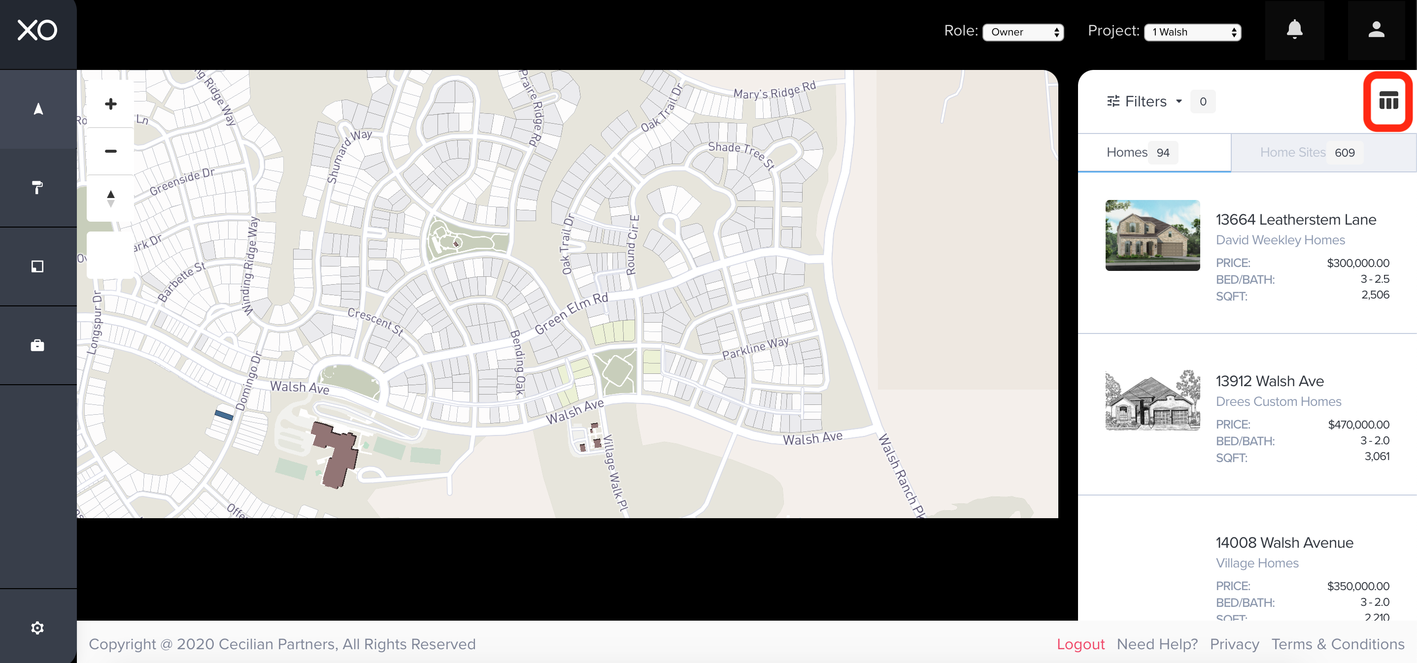 Below is the Homes & Lots page, go to the right panel for Homes and Homes Sites. Click on the icon highlighted in the RED box below for the Table View of the Homes and Home Sites.