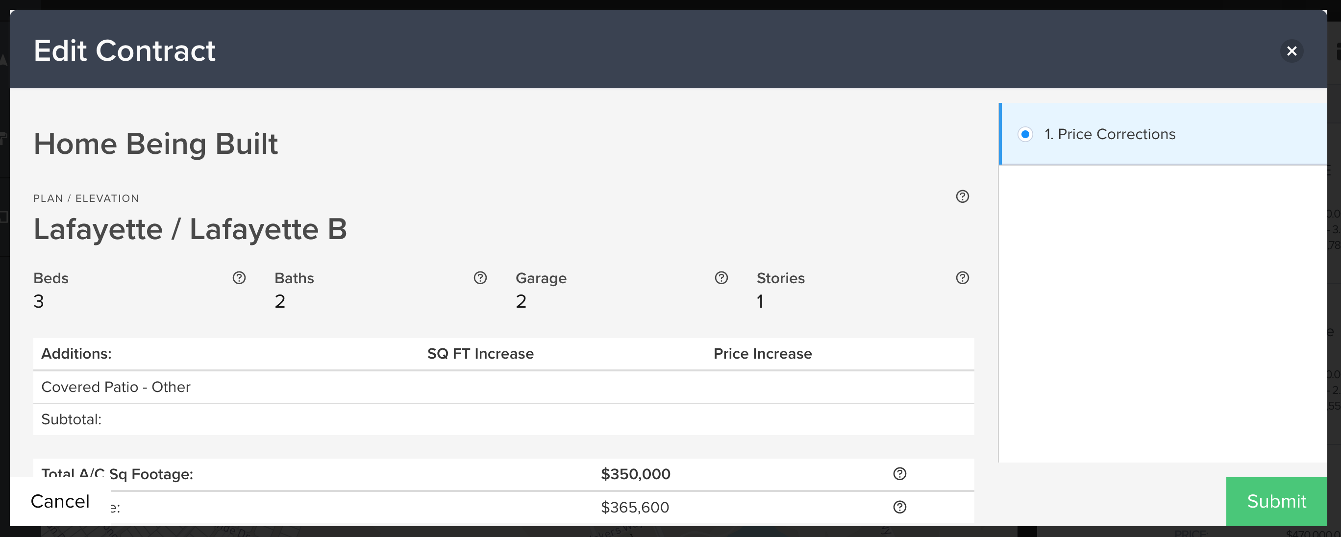 The finally step to complete the Contract form is to adjust price corrections based upon the buyer's selections of the home built being. Once this step is completed, click Submit in the green box in the lower right-hand corner of the form.