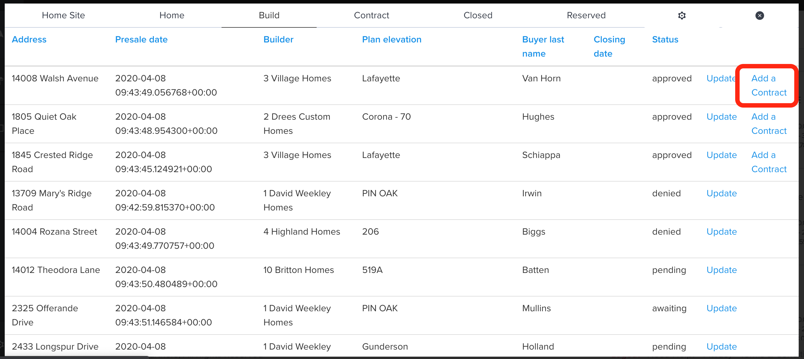 Locate the home in which a contract needs to be added. After locating the home, go to the right of the table and click Add a Contract highlighted in the RED box.