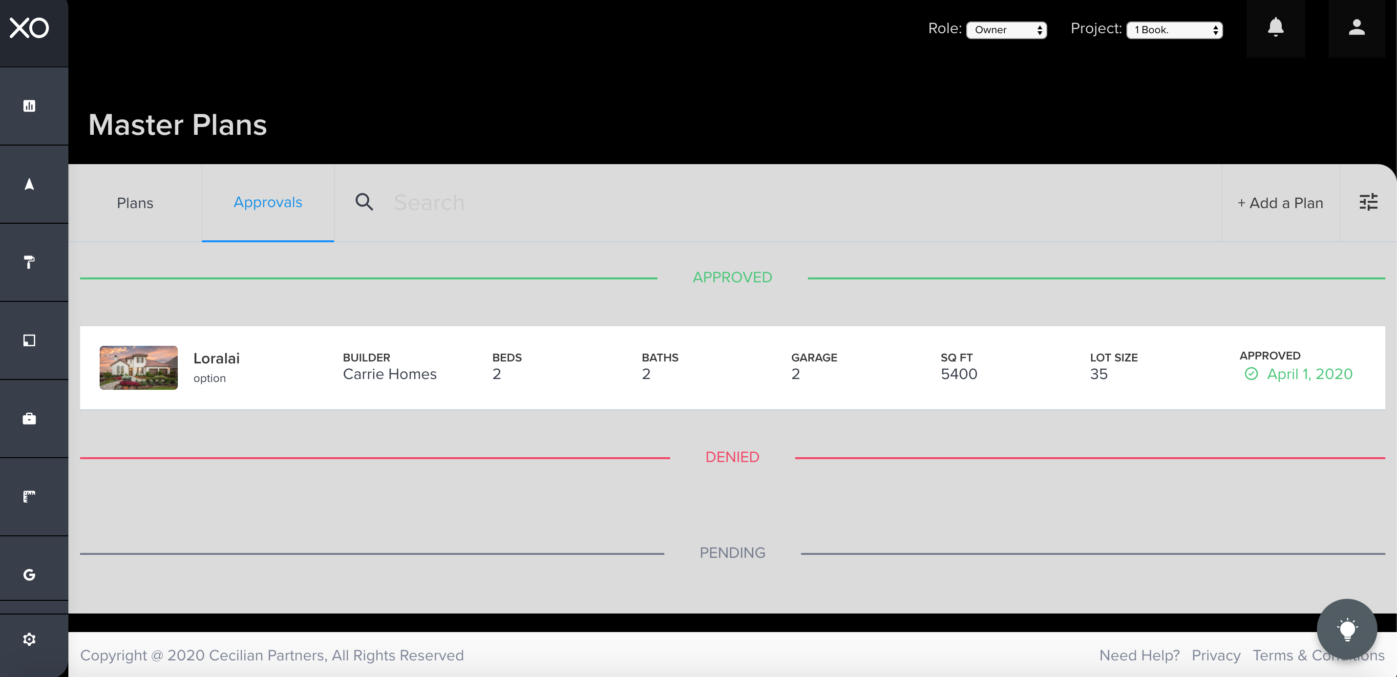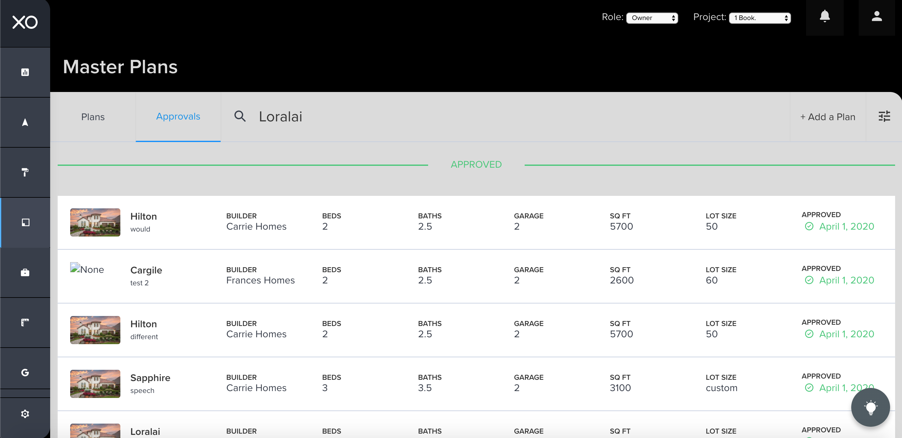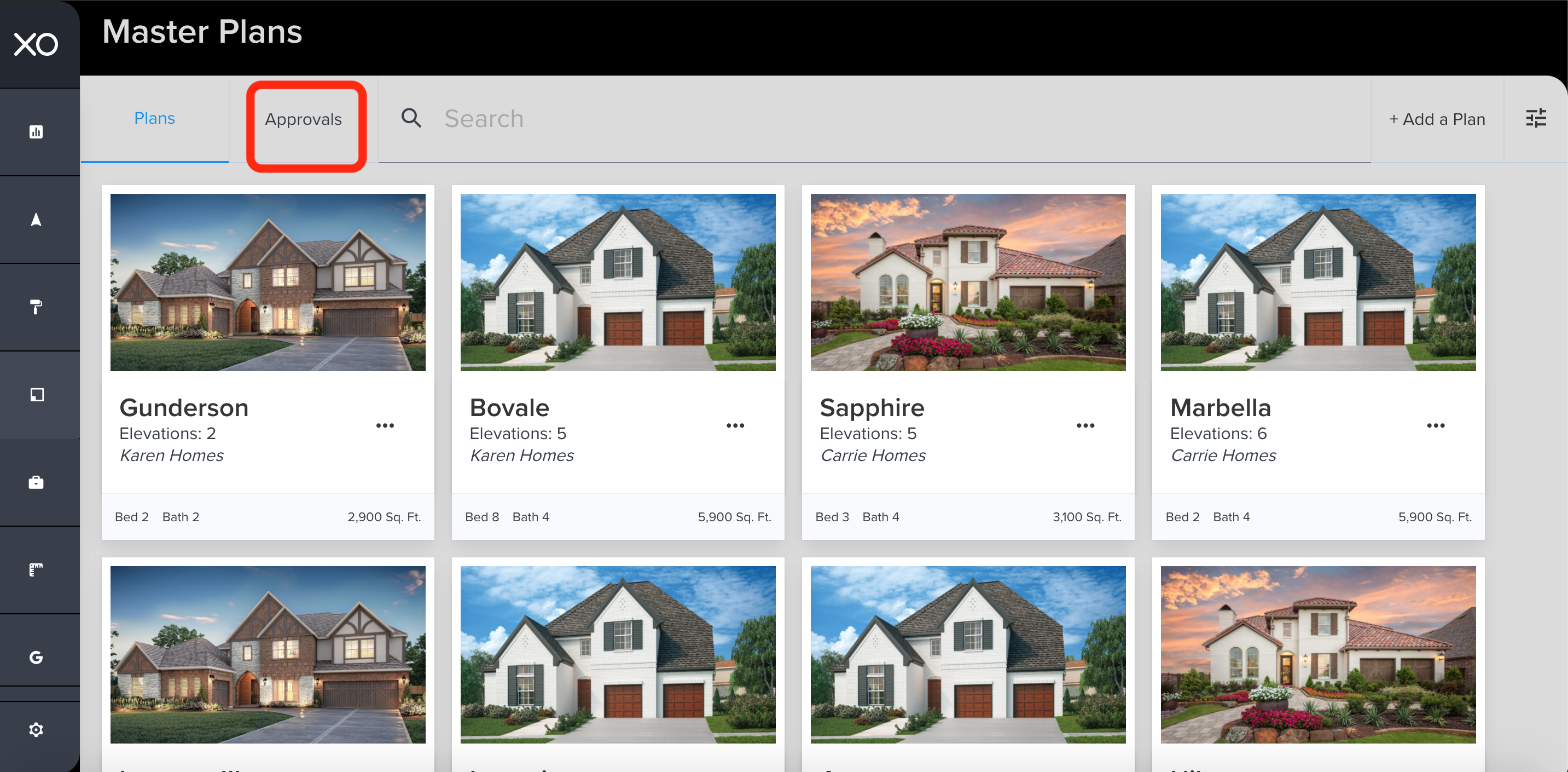 When a builder submits a new elevation into the XO, the approved developer users have the ability to review and approve new elevations in the XO. This helps speed up the approval process when building a home. Step 1 First, go to the Master Plans page ...