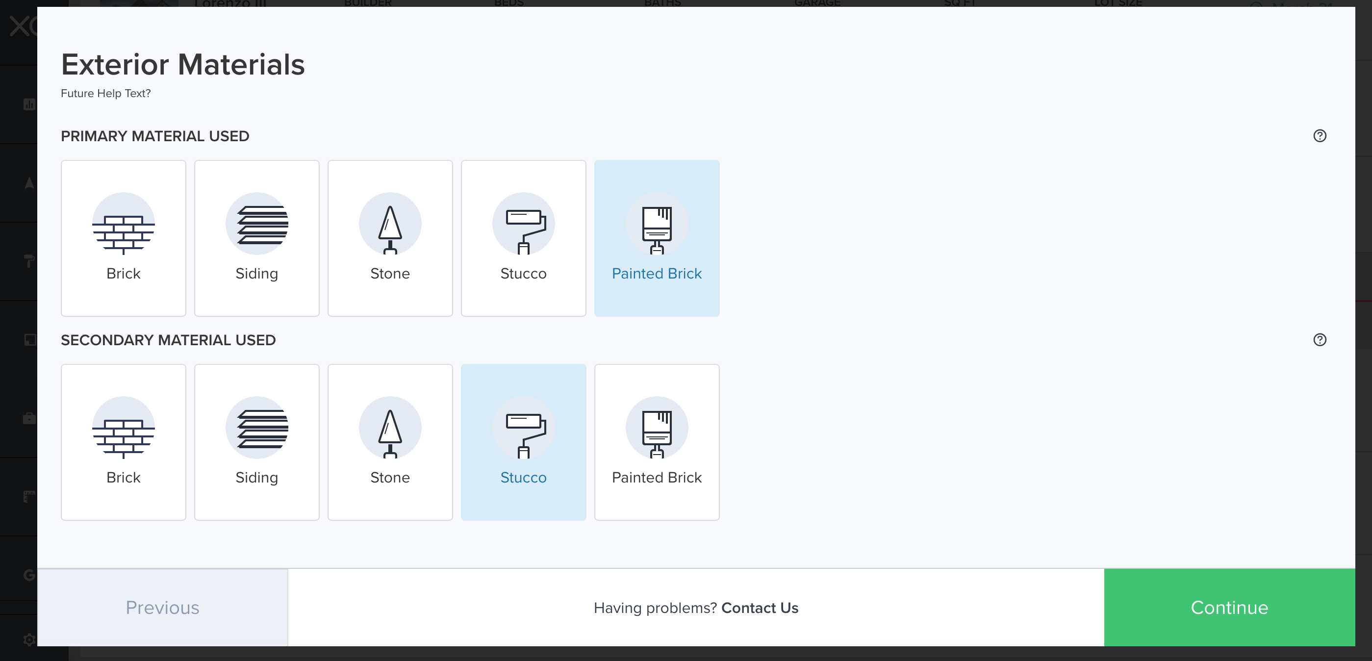 Based on the feedback provided as to why the plan/elevation was denied edit the necessary items in the sections (shown below). Once completed, click CONTINUE. Note if a section does not need to be updated simply click Continue to move to the next section.