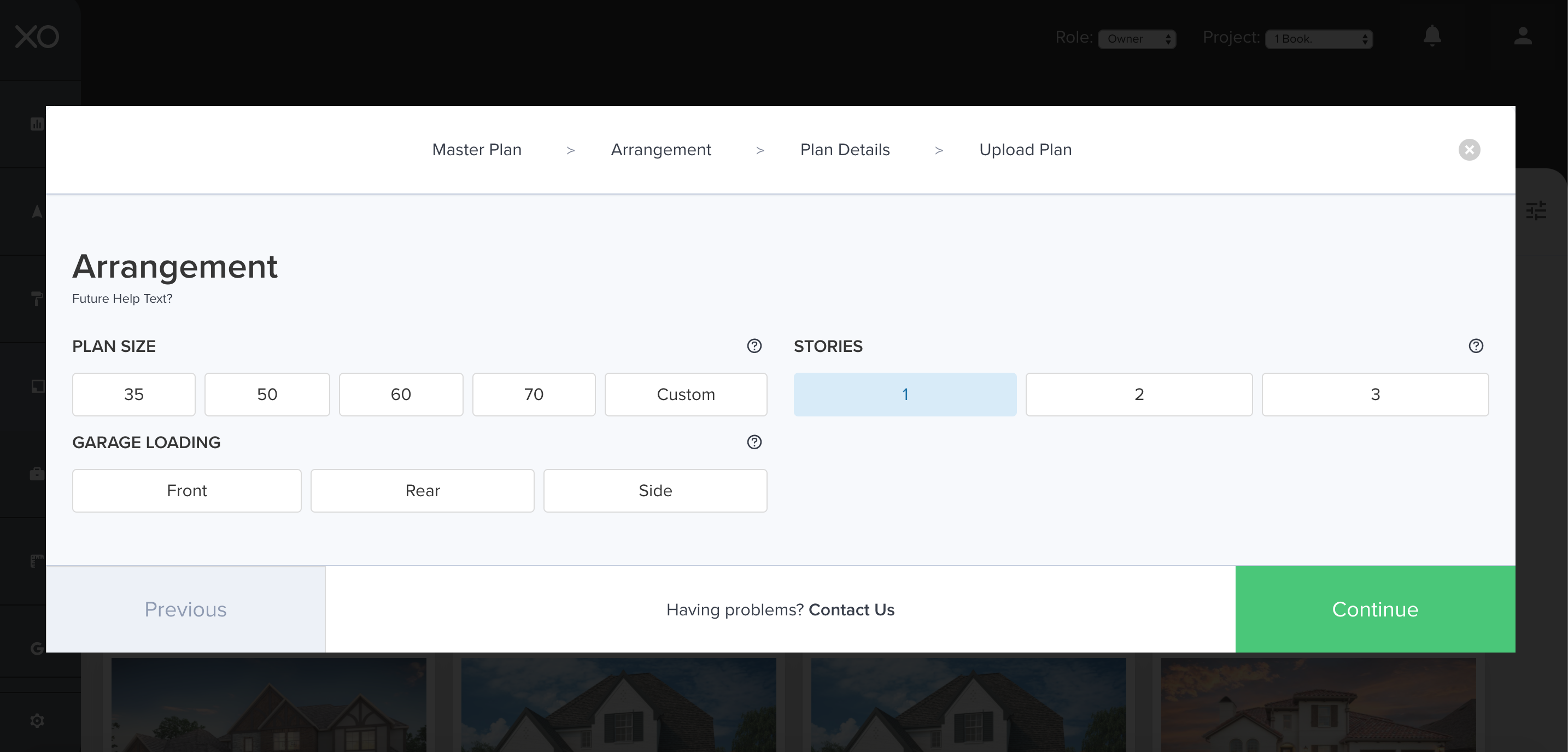Arrangement - Be sure to complete Plan Size (30', 50',etc.), Stories (Remember the system will default to 1 Story), and finally the Garage Loading. Reminder: ALL fields below require a selection. Once all fields are completed, click CONTINUE to proceed to the next page.