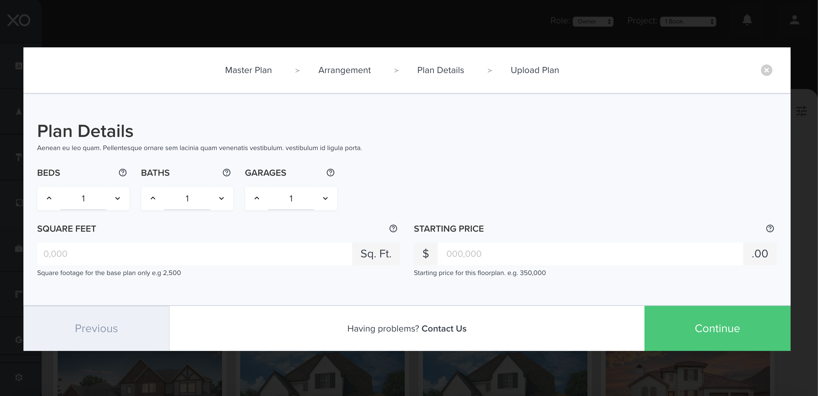 Plan Details - All fields below are required to be filled. For the Bed/Bath/Garage count, please be sure to enter the minimum amount for each. Users can add more in the Additions feature. Once the Plan Details are completed, click CONTINUE to proceed to the next page.